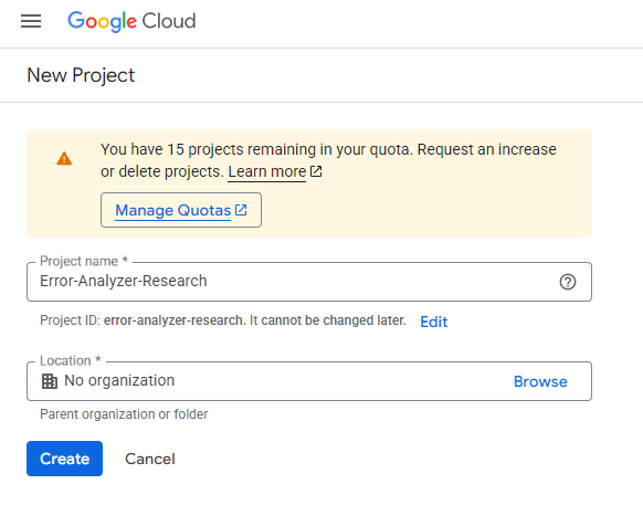 - Click the project dropdown at the top and choose New Project. Give it a simple, descriptive name, such as Error-Analyzer-Research.