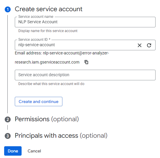 - Enter a name and description (for example NLP Service Account), then click Create and Continue.