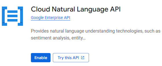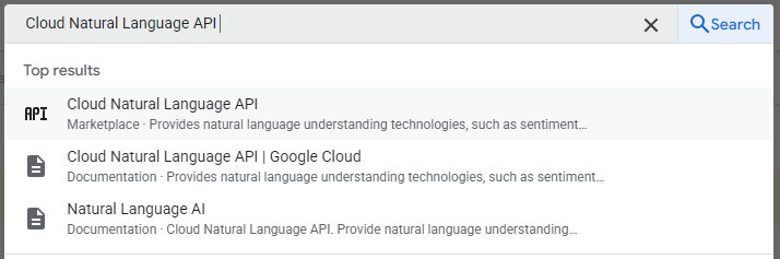- In the results, click the first entry labeled Cloud Natural Language API (with the API icon).